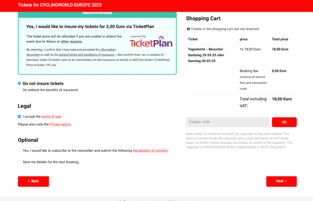 Bei der Ticketbestellung ein klassischer UX Fehler: man muss auf der linken Seite diverse Antworten klicken und wird so zu dem Button unten links geführt: dort steht aber nicht 'Weiter' sondern 'Back'.