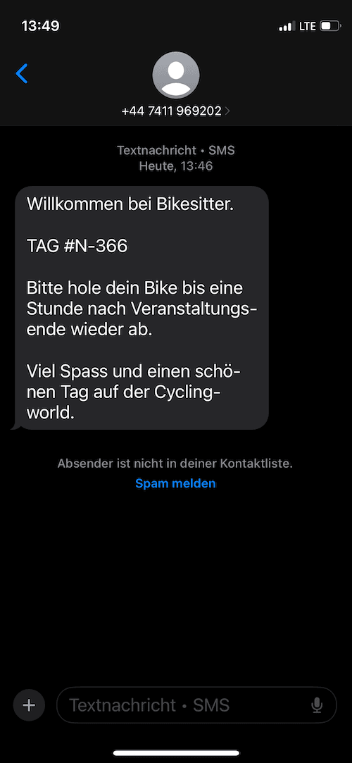 Heute standesgemäß mit dem Gravelbike zur cyclingworld nach Düsseldorf. Das Schloß hätte ich nicht mitschleppen müssen: man kann sein Rad ja abgeben. Dazu gibt man Telefonnummer und Name an, dazu ein 'Beweisfoto'. Und dann bekommt man die nebenstehende SMS. Bei Abholung werden einfach alle Daten gelöscht.