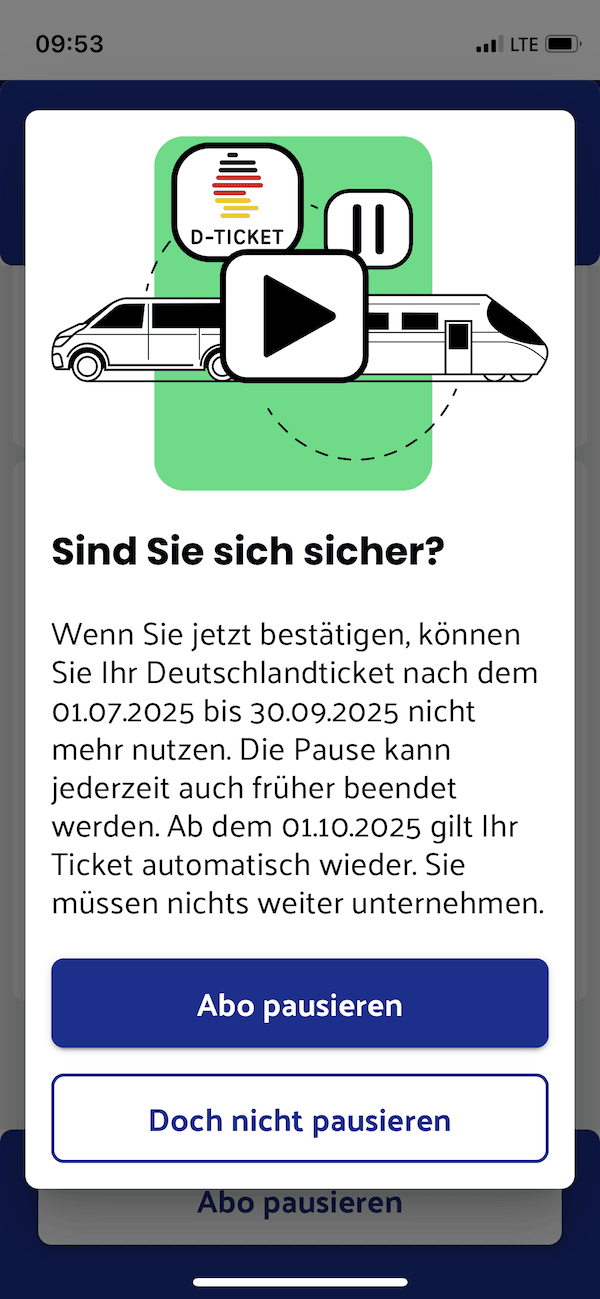 So einfach geht das: auf 'PAUSIEREN' klicken und bestätigen. Fertig. Dann werde ich im Juni mal noch ein paar Fahrten machen.