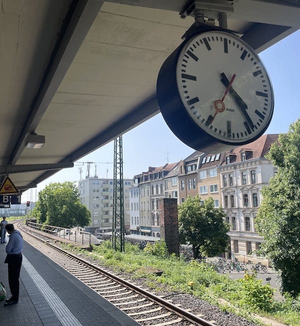 Kundenbesuch in Bonn: am Bahnhof Köln Süd hängt eine kaputte Uhr. Wenn man es schon nicht schafft, sie zu reparieren, dann zumindest abdecken, sonst ist die Verwirrung komplett beim Warten auf den (verspäteten) Zug.