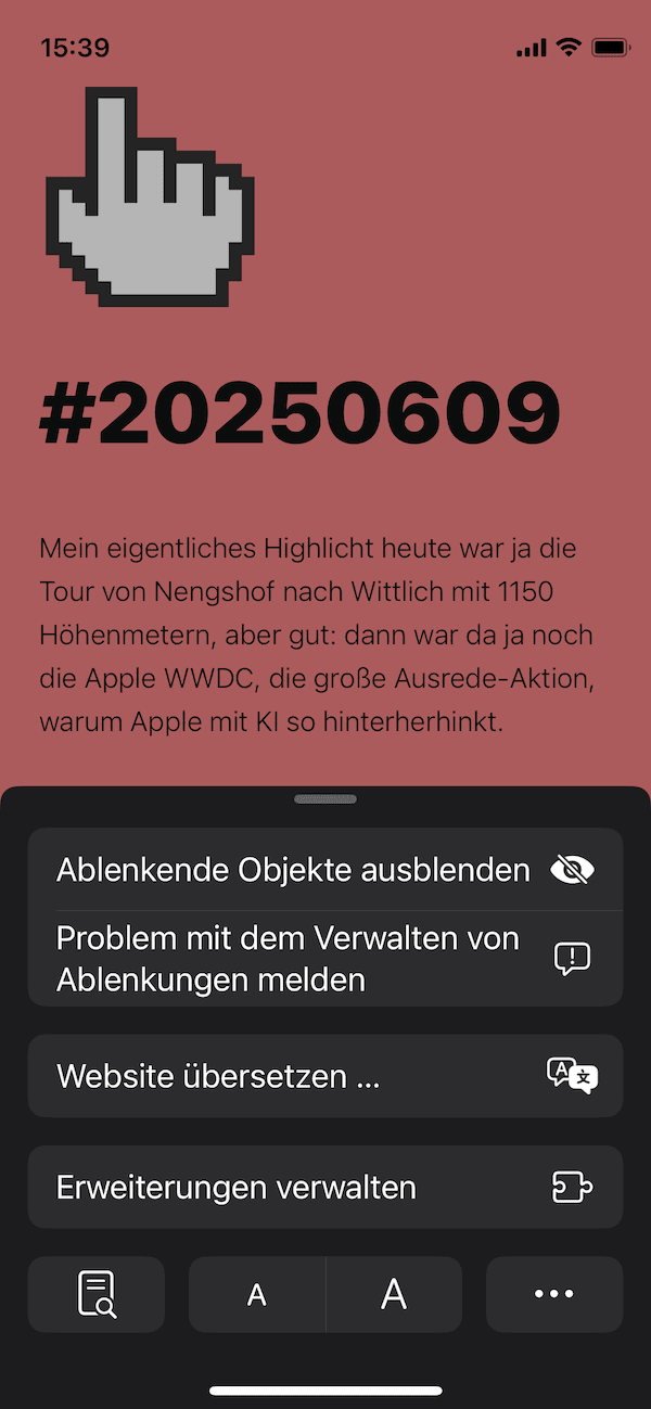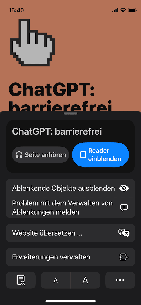 Nochmal Barrierefreiheit: auf den mobilen Browsern wird ja oft der Hinweis (in der Adresszeile) eingeblendet: Reader verfügbar. Aber wann genau wird das angezeigt und wovon hängt das ab? Die eine Seite hat die Option, die andere nicht. Und die haben ja technisch gesehen exakt den gleichen Aufbau.