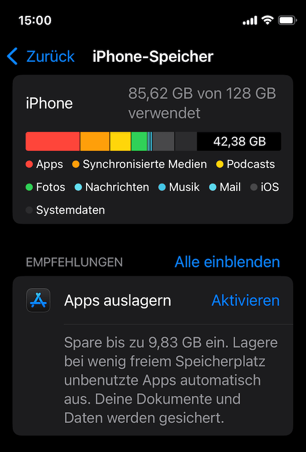 Dann hab ich noch mal den Speicher angeschaut: da waren 112 von 128 GB belegt. Hmm, war ich nicht mal unter 100 GB? Ist Apple Itelligence Schuld? Keine Ahnung. Einfach mal plumb vom größten Batzen (synchronisierte Medien = Musik: 45 GB) was weggeschmissen: ZACK, alles fluppt wieder wie es soll.