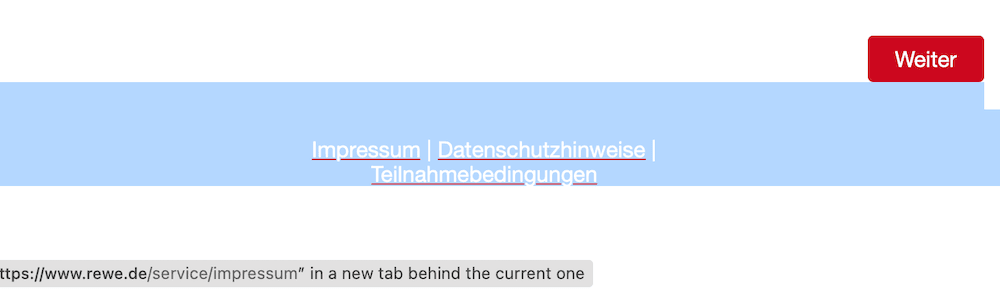 Rewe wollte wissen, wie mein letzter Einkauf war, na gut, vielleicht gewinn ich ja die 25€. Und ich frag mich die ganze Zeit, was das für ein grafischer Abbinder da unten ist ... ah, weisse Schrift auf weissem Grund. ;-D