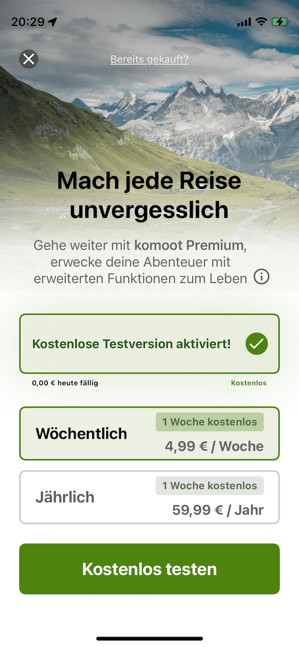 So, jetzt hab ich nur noch Basic komoot. Natürlich möchte man den User zum Zahlen überreden. Oder übern Tisch ziehen. Denn die erste Option muss ich auch bezahlen, jedenfalls poppt der ApplePay Screen auf. Wenn man dann 0€ bezahlt, landet man wohl nach einer Woche im 4,99 Paket.
