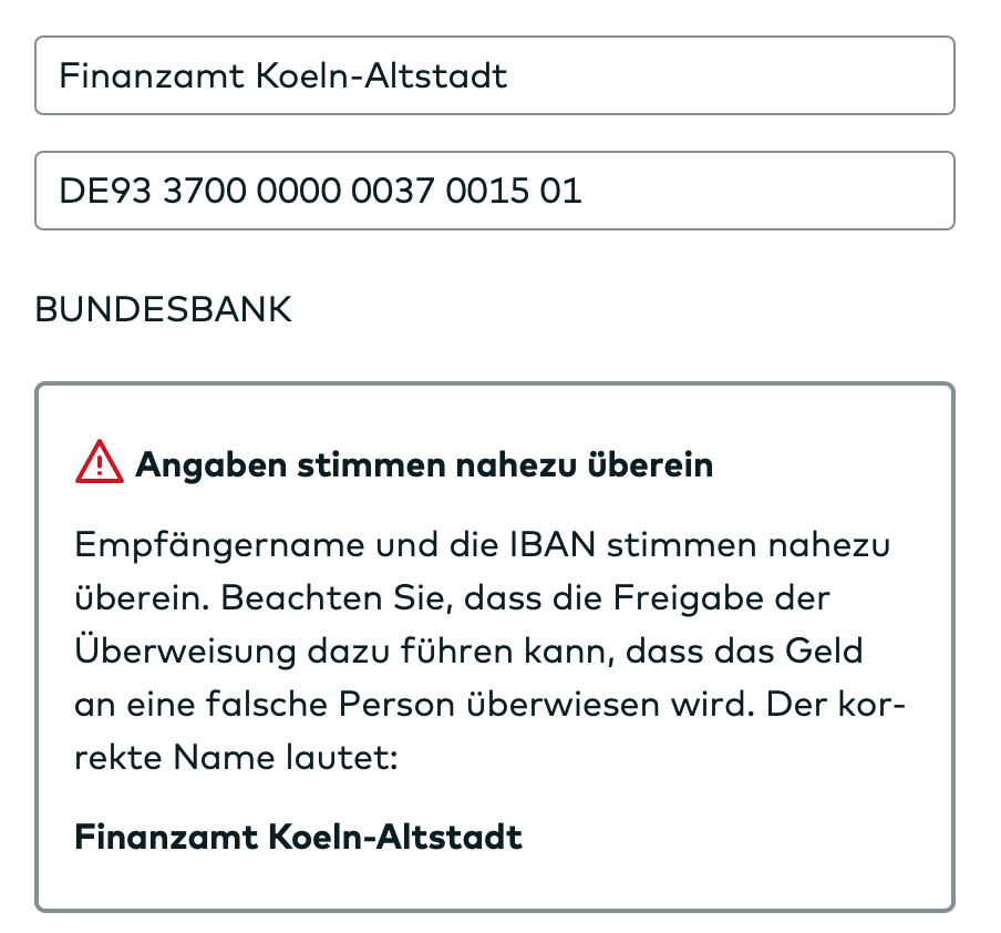 Wieder auf den letzten Drücker die USTVA gemacht. Dann bisken Geld ans Finanzamt überweisen, da sehe ich das erste Mal, das IBAN und Empfänger jetzt (besser?) überprüft werden?! Ich dachte, das passiert schon immer!