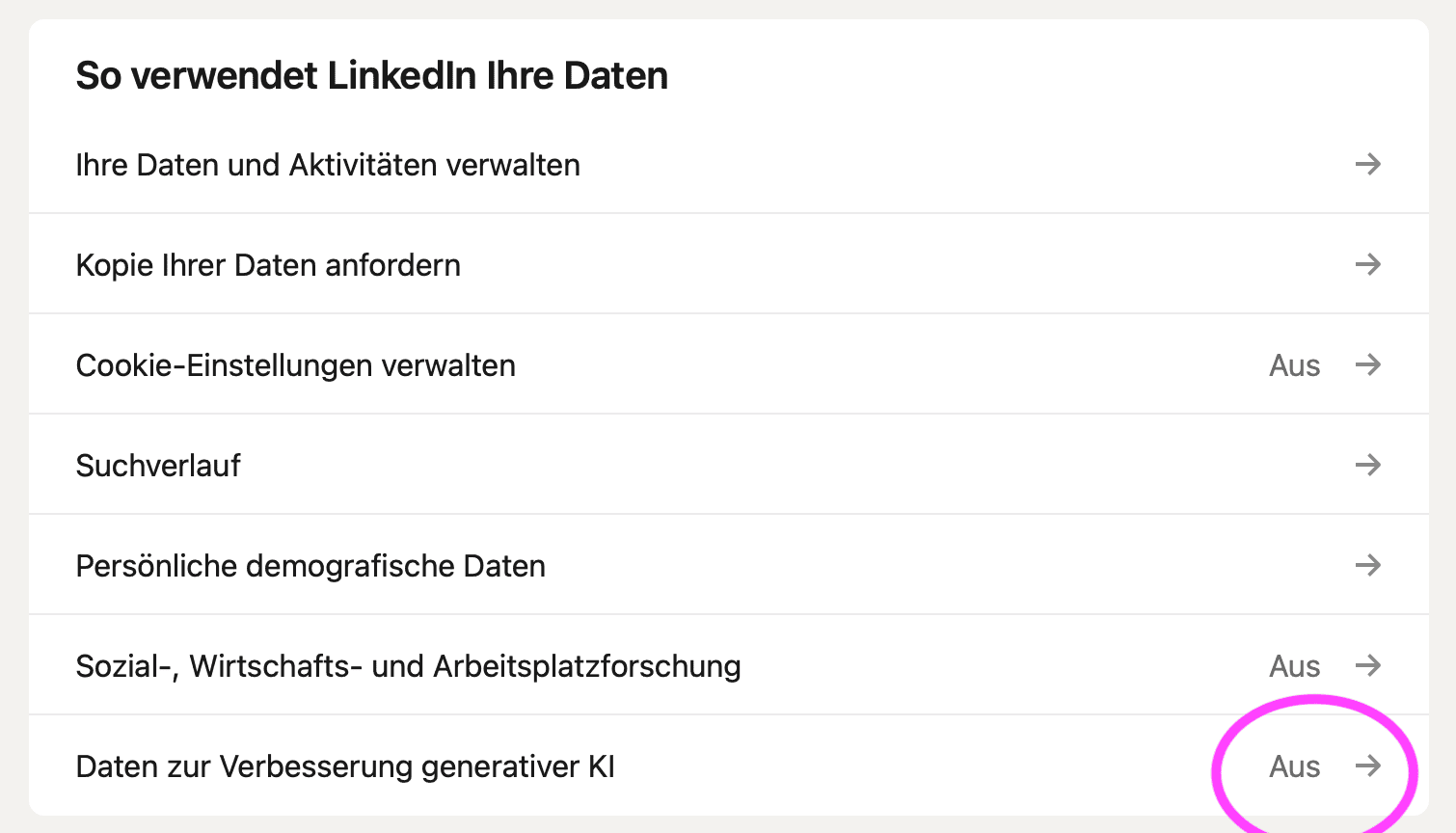 Heute zufällig auf Mastodon gelesen: man kann bei linkedin die zukünftige Nutzung seiner Inhalte für KI unterbinden. Irgendwo bei Datenschutz & Privatsphäre.