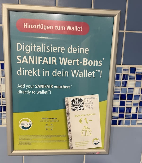 Werbung wirkt: beim Pinkeln ein Plakat gelesen: speichere deinen Sanifair Bon im Wallet. Jetzt hab ich einen Sanifair Euro im Wallet. Mal sehen, ob ich den je einlöse.