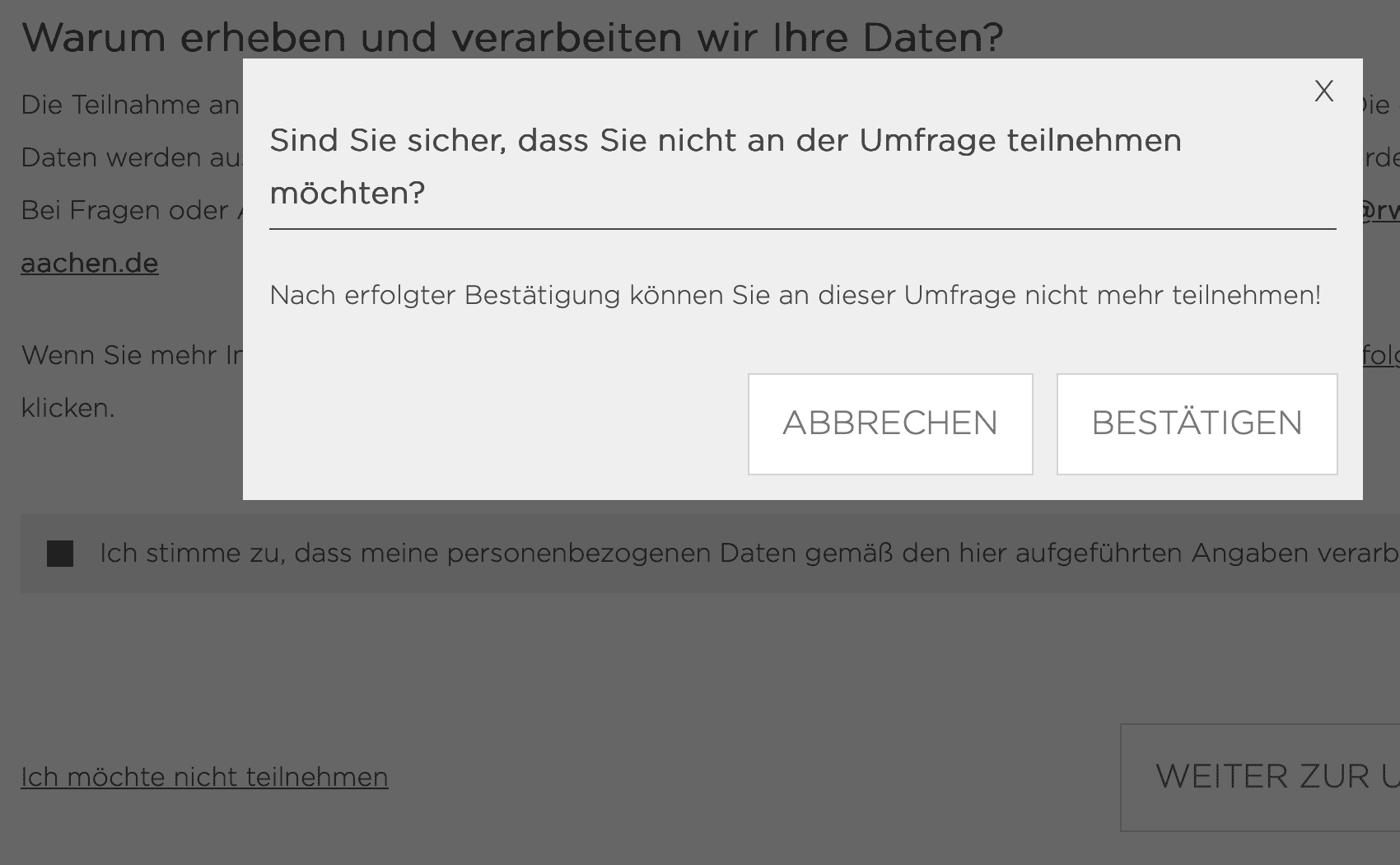 Aber eine Umfrage erstellen - hier war es zum Thema Fahrradunfälle - die man ja nur aufruft, wenn man teilnehmen will, und dann dort VOR dem Start der eigentlichen Umfrage einen "Ich möchte nicht teilnehmen" Link einzubauen, ist ja schon komplett schwachsinnig.